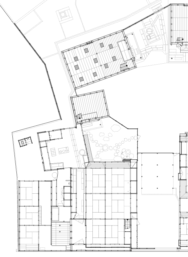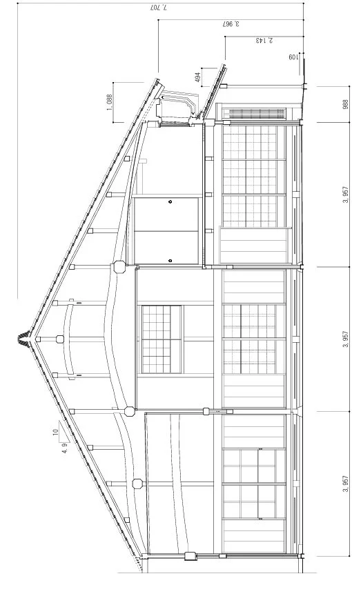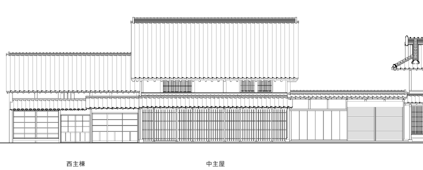 表構えは、1階に出格子を備え、2階は垂木まで塗り込め、内側に繰り型の施された袖壁を備えている。
